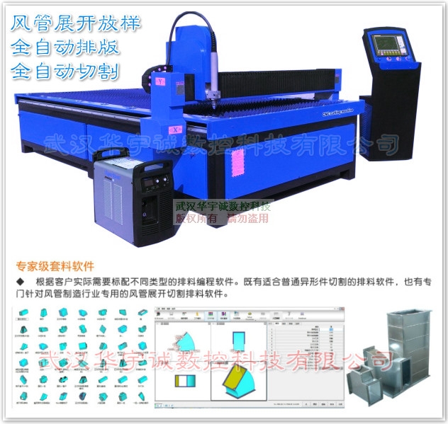 所謂的風(fēng)管我們可以按按截面形狀,風(fēng)管可分為圓形風(fēng)管,矩形風(fēng)管,扁圓風(fēng)管等多種,其中圓形風(fēng)管阻力小的高度尺寸大,制作復(fù)雜。所以應(yīng)用以矩形風(fēng)管為主。按材質(zhì),風(fēng)管可分為金屬風(fēng)管,復(fù)合風(fēng)管,索斯風(fēng)管等。當(dāng)今市場上等離子風(fēng)管切割下料設(shè)備繁多,那么今天華宇誠數(shù)控科技有限公司就本公司生產(chǎn)的風(fēng)管下料切割機(jī)其中的一種設(shè)備數(shù)控等離子風(fēng)管切割機(jī)做個(gè)簡單介紹:全自動(dòng)風(fēng)管等離子切割機(jī)主要是完成部件的自動(dòng)化放樣和切割,只需要要在2維或3維圖形中輸入想要的尺寸,軟件就可以自動(dòng)套料,然后等離子切割機(jī)可以自動(dòng)將圖形切割機(jī)出來。法蘭、咬口、大板拼接的預(yù)留量電腦都能自動(dòng)計(jì)算。